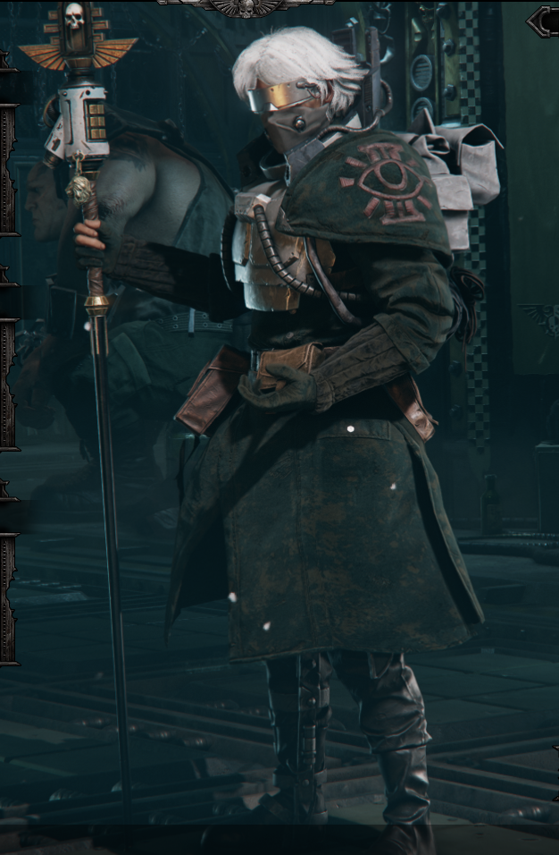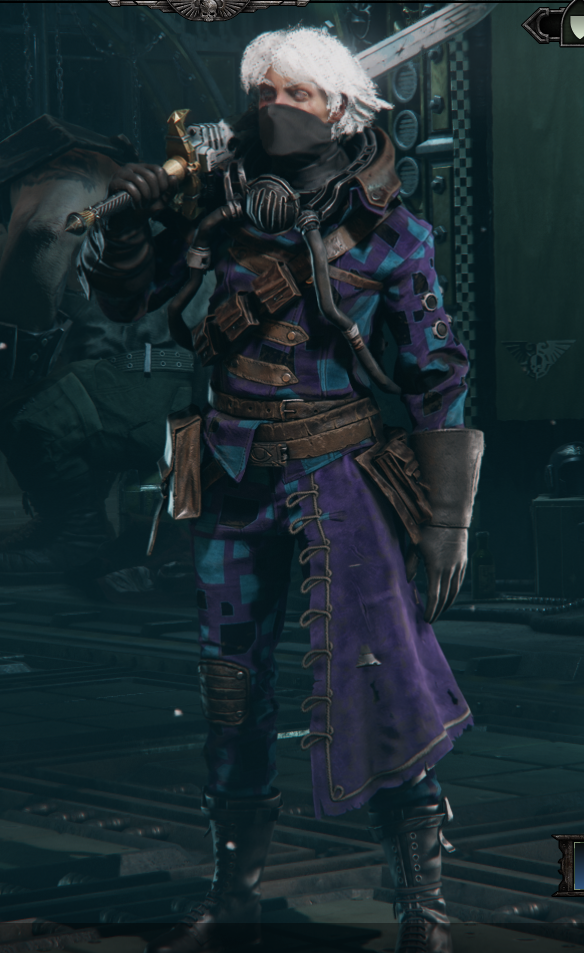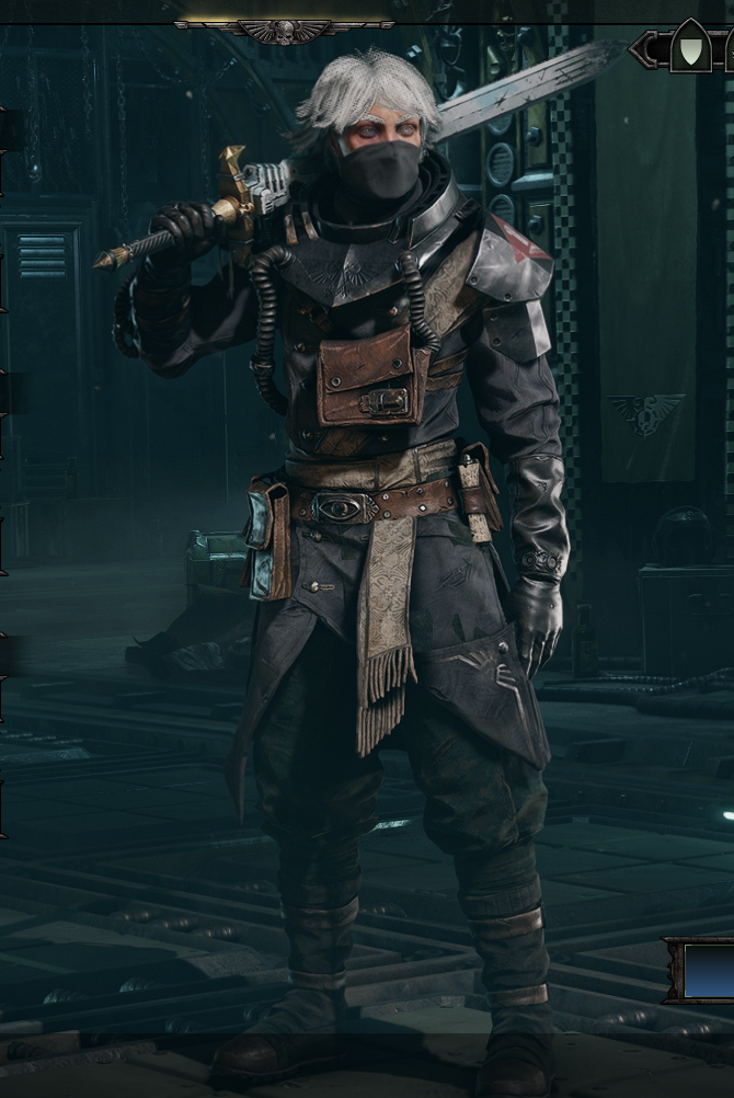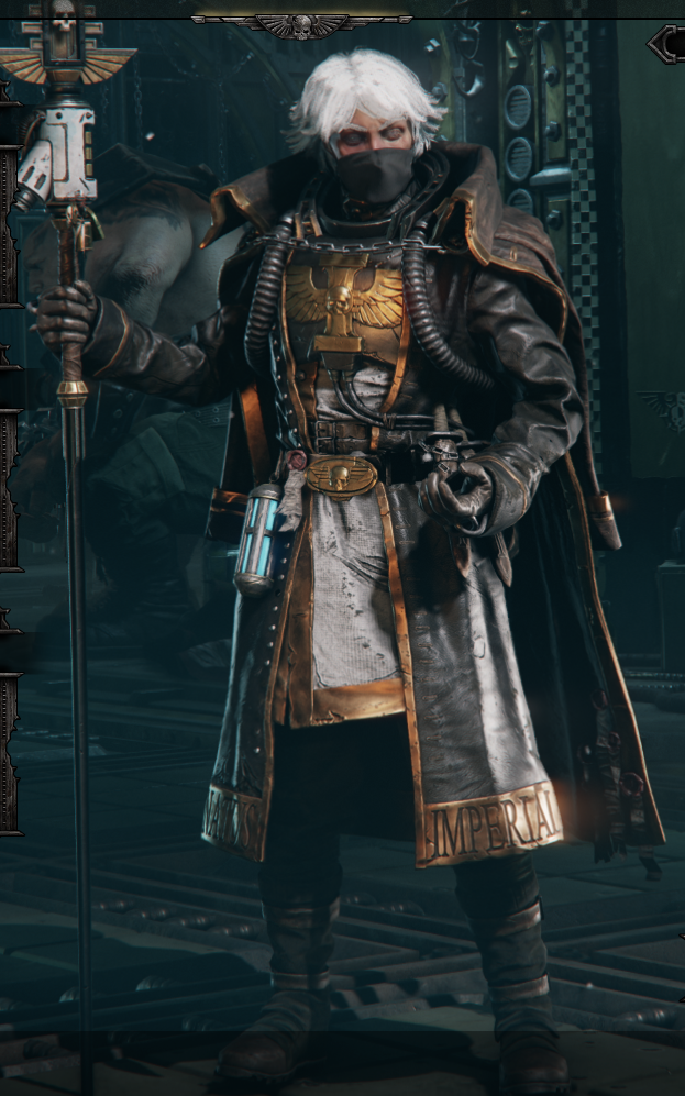 main in-game Darktide outfit rogue trader mercenary by psykerkitty alt outfit 1 alt outfit 2 alt outfit 3
