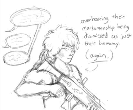 While Silver is generally difficult to coax into outwardly showing irritation, curiously despite their restraint they become visibly annoyed by claims their potent biomancy is the real root of their highly impressive marksmanship. They are quick to remind their biomancy does not enhance their firearms in any way, their abilites do not manifest as sharper senses, and even the quick reflexes of superhuman speed are inhibited by the maximum speed of a gun's mechanical workings — there is only but so fast a trigger can be pulled or a gun can be reloaded without harming the gun. Even early in their childhood the seasoned adult Cadian soldiers in their life considered them a child prodigy, and they have tirelessly practiced their marksmanship every moment of their life they have been allowed to handle any kind of gun, starting years before even the barest whisper of their psychic abilities manifest; their skill is not some fickle bestowment of the warp but stems from their own passion for firearms and persistent drive for improvement at handling them.