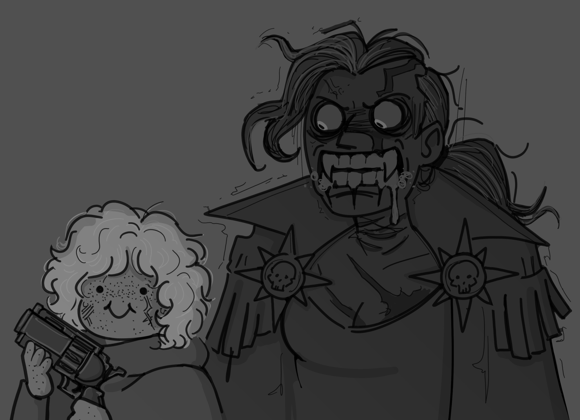 It never even vaguely occurred to them the ogryn would notice them. His voice sounded suddenly closer when he spoke again, and they lifted their hand from their eyes to see he was kneeling next to their table, his friendly face level with their own as he asked, still laughing, if they liked his joke and wanted to hear another. The humorless veteran standing next to the ogryn huffed a sigh and rolled his eyes, clearly the one who had been subjected to the ogryn's jokes before Silver. Utterly shocked out of the grief they had just minutes before been steeped in by the ogryn's kindness, they breathlessly replied they would love to hear more, and he stayed with them the rest of their shared alloted mealtime, telling them every groanworthy joke and pun he could think of and delighting in their laughter.