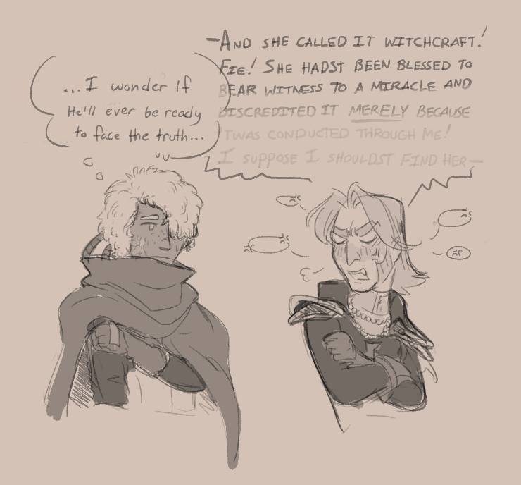 It would not be enough to save them; not yet. They would not remember his face at the time, though he would remember theirs. But one time during the Mourningstar's day cycle Silver found themself at the mess hall on rare occasion, seated alone at a table staring into the wall across from them with only their half-empty cup of water, adrift in the sea of their own misery. They scarcely took notice of anyone around them, the voices and thoughts of the others around them mingling together in a cacophony from which they couldn't pull a single person's words. And yet...